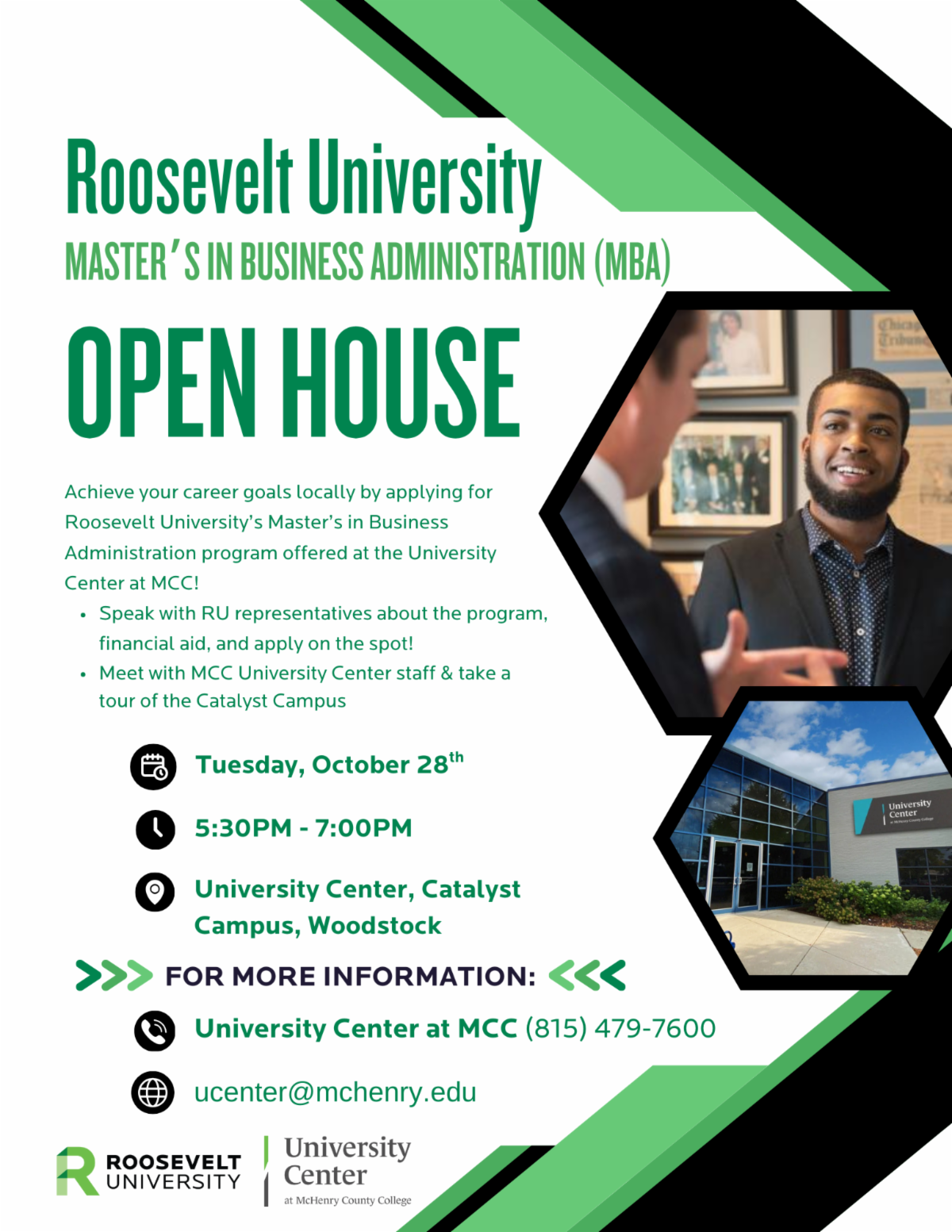 Attend this Open House, hosted by the University Center at MCC and Roosevelt University (RU), to learn more about the Master of Business Administration (MBA) program.